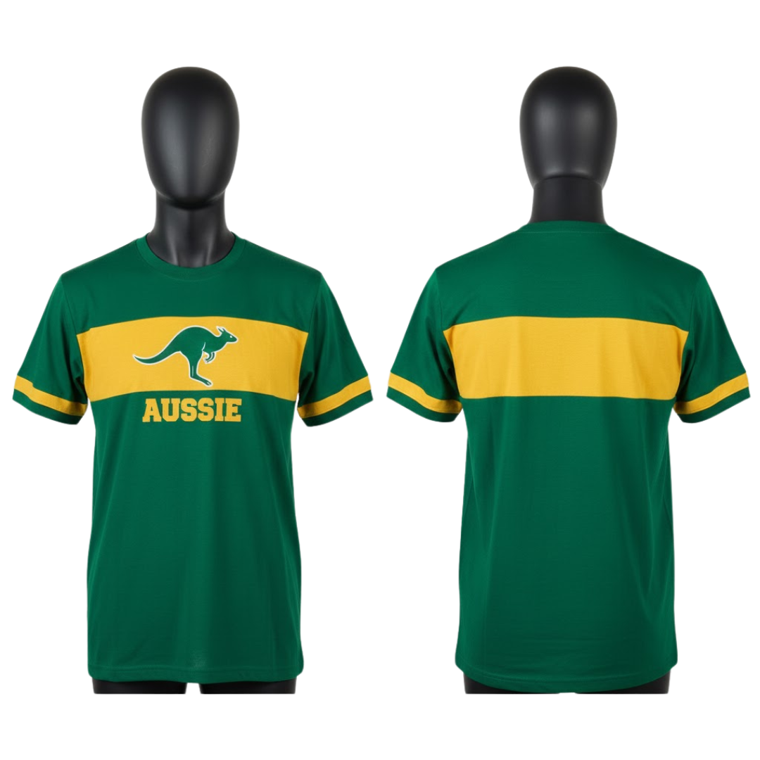 Half sleeve crew neck shirt with heat transfer logo on front.